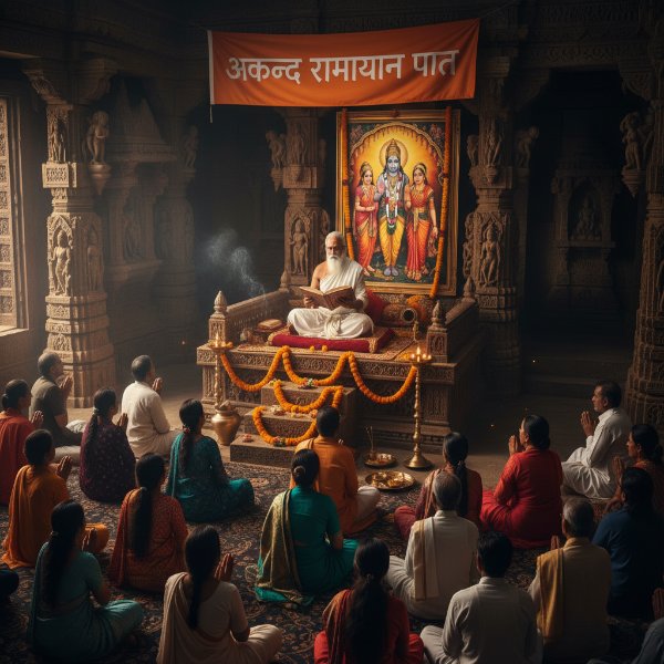 Continuous Ramayana recital for blessings, peace, and removal of negativity. Add-ons: 24hr live streaming, decoration, bhajan group.